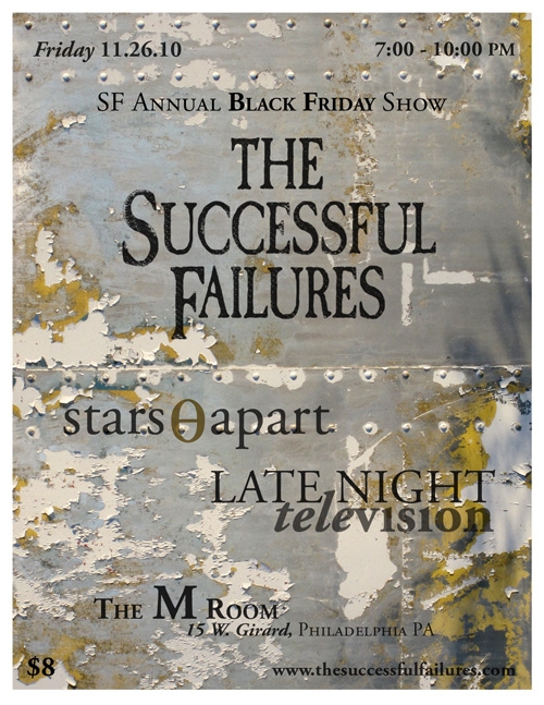 We are thrilled to unveil our new promo poster for this year’s Black Friday Show.  Local NJ Graphic Design Artist, Laura Baird, worked with us on this one.  Laura designs posters and flyers for the Record Collector.  Really cool stuff – we look forward to working with Laura on future projects!  In other news… the Successful Failures have donated a live recording of a set from this summer to The 3rd Annual Banding Together: Benefit Webathon for The Spondylitis Association Of America.  Tune into BlowUpRadio or The Penguin Rocks this Saturday 10/16/10 at 7:15 to listen to the Successful Failures.     – Mick